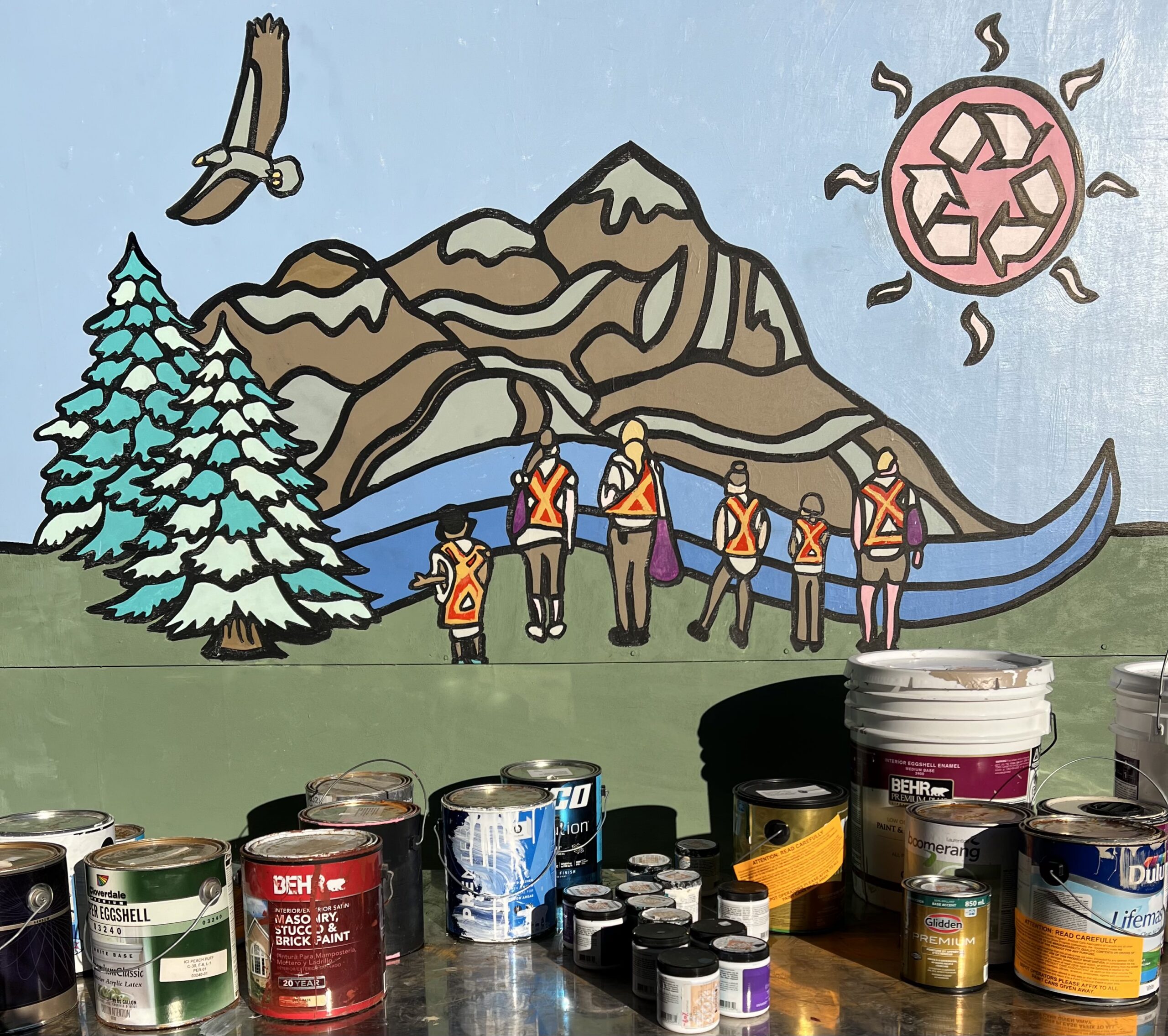 Local artist Alex Neff picked up reclaimed paint through PaintShare program and turned a blank depot wall into a full landscape scene: mountains, evergreen trees, an eagle in flight, community volunteers, and a recycling-symbol sun. Every colour in the mural came from paint that residents had dropped off.